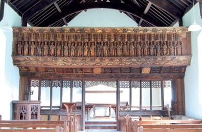 Uncovered only in 1968 by roofing contractors, is a stone mural staircase the entrance to which is located in the South wall, access is between two rows of pews. During the latter middle ages (c.1300- 1500) many churches were furnished with a rood screen. In the 15th century many rood screens were surrounded by a gallery known as a rood loft, thus St David’s would have had its own rood screen and loft. The rood comprised scenes of the crucifixion beautifully carved and painted with flanking figures of the Virgin Mary and St Peter. Unfortunately it was destroyed during the latter part of the Reformation around 1600 AD, but would have looked very similar to the one below.